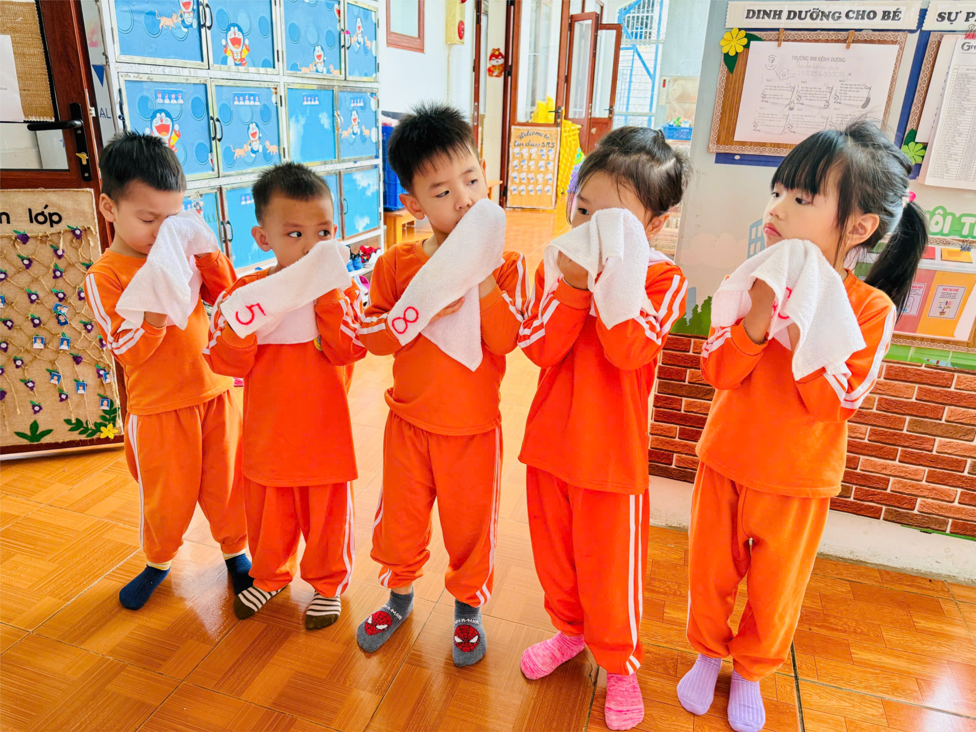 Nhà trường luôn chú trọng giáo dục kỹ năng sống và chăm sóc sức khỏe cho trẻ ngay từ những việc nhỏ nhất, giúp bé phát triển toàn diện – cả thể chất lẫn ý thức tự chăm sóc bản thân.